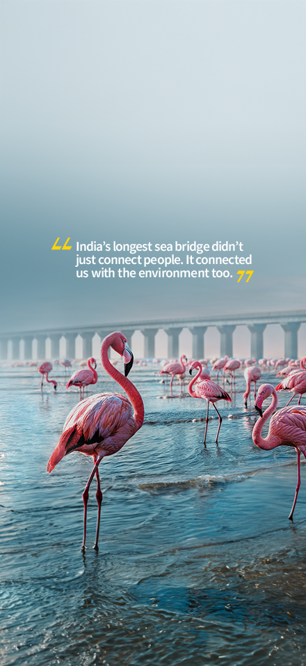 The challenge before L&T, as responsible builders of infrastructure, was to build a ‘green’ bridge deploying the most sustainable methods of construction. Apart from executing in an ecologically sensitive zone, for the Sewri mud flats are earmarked as an Important Birding Area (IBA) and home for a variety of birds including the pink-necked flamingos, our challenge was to build without interfering with the lives of the birds, flora and fauna around, and keeping their habitat pristine.