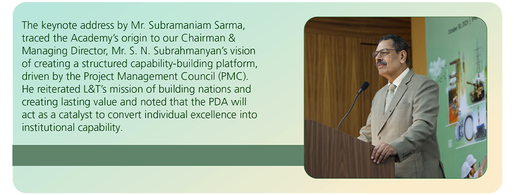 This vision has been translated into reality through a landmark initiative to strengthen L&T’s project leadership capability. The Project Director Academy reinforces L&T’s commitment to project execution excellence across businesses and geographies, ensuring that we continue to deliver large, complex, multidisciplinary EPC projects that shape India’s infrastructure and enhance our global footprint. It reflects our belief that building leadership from within is the cornerstone of sustained organisational success.